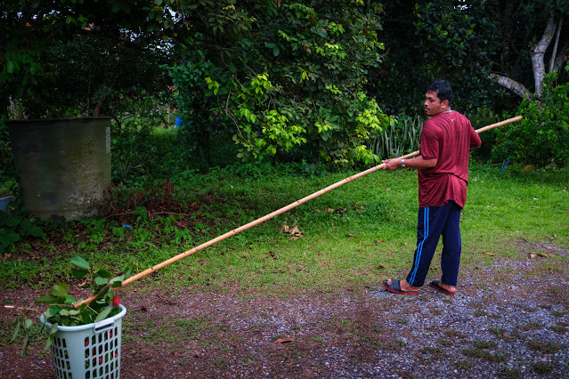 On our small farm in central Thailand we have several rambutan trees. Long bamboo poles are used to reach the fruit high in the trees.